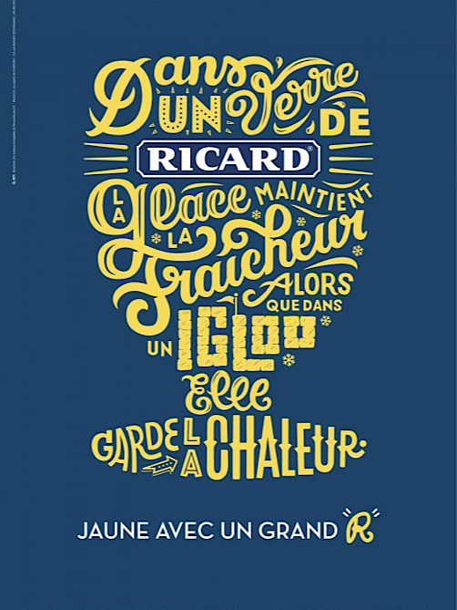 Quant aux calligrammes, ils sont toujours dans l’air du temps. Il n’est pas rare de voir une publicité présentée dans un dessin. Dans une campagne publicitaire, la marque Ricard n’a pas hésité à utiliser le calligramme pour représenter les éléments fondateurs de l’identité de la marque tels que le verre ballon ou le pichet Ricard.