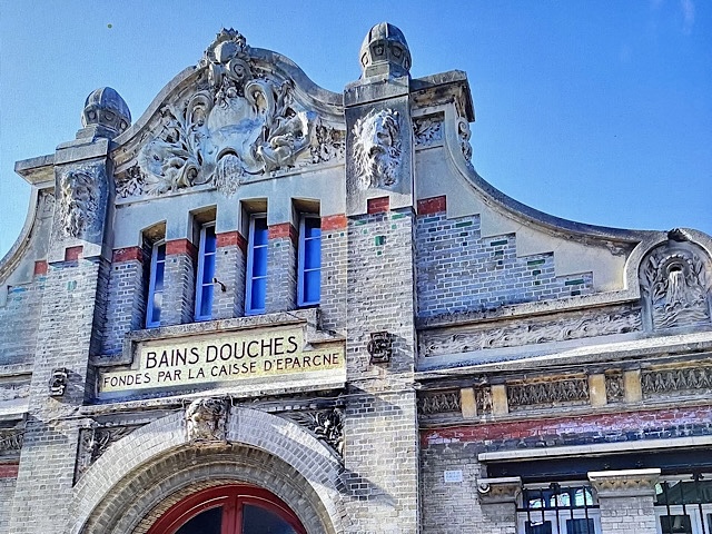 C’est sont les Caisses d’Épargne qui vont financer la construction de bains-douches dans les villes françaises. Ces thermes seront tous bâtis de la même façon : un mélange de pierres meulières et de briques, un fronton en demi-cercle sur lequel on peut lire l’inscription « Fondés par la Caisse d’Épargne ».